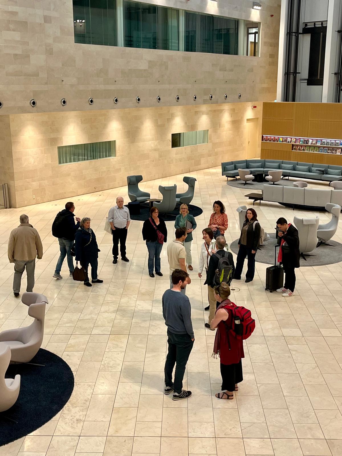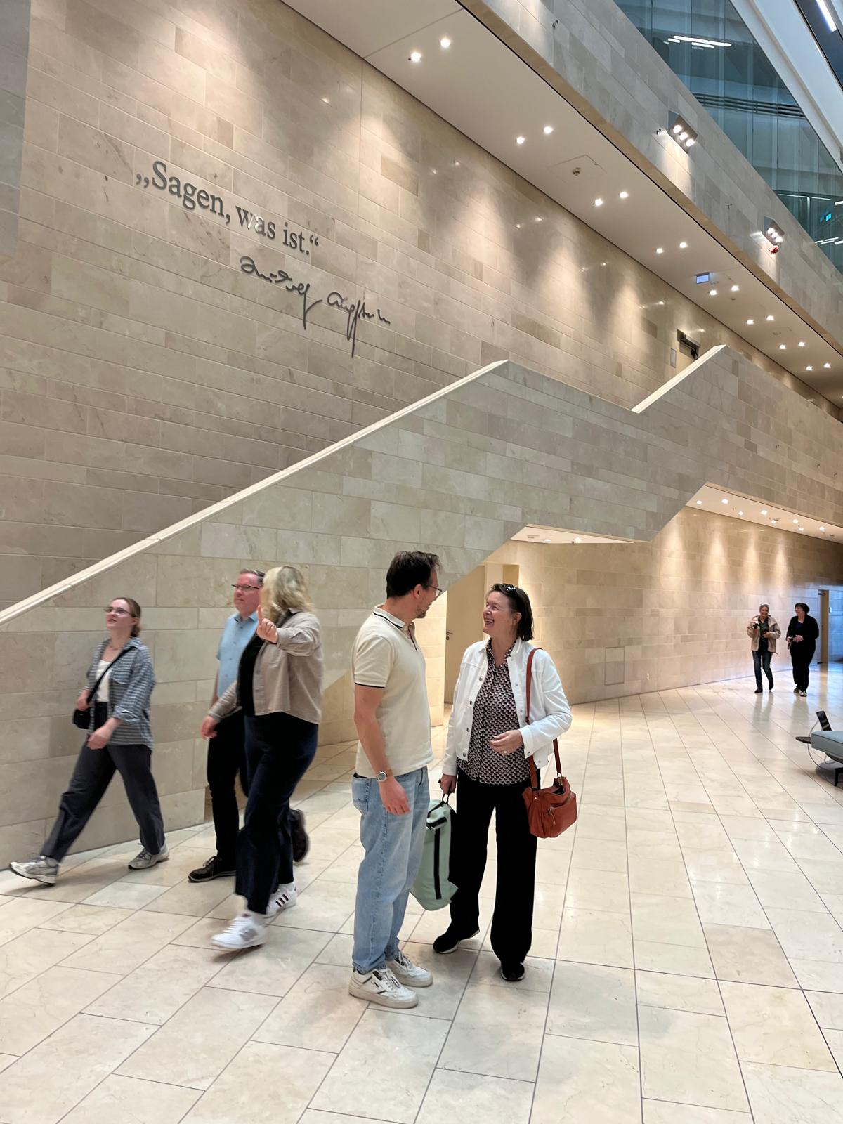 Das architektonische Kontrastprogramm dazu war das grellorange Interieur der im neuen Spiegel-Haus wiederaufgebauten, legendären Kantine. Zuvor aber ließen Dokumentationsredakteur Gerrit von Northeim, Datenjournalistin Anne Behrend , Leonie Voss und Jens Witte die Arbeit im Spiegel-Haus lebendig werden.